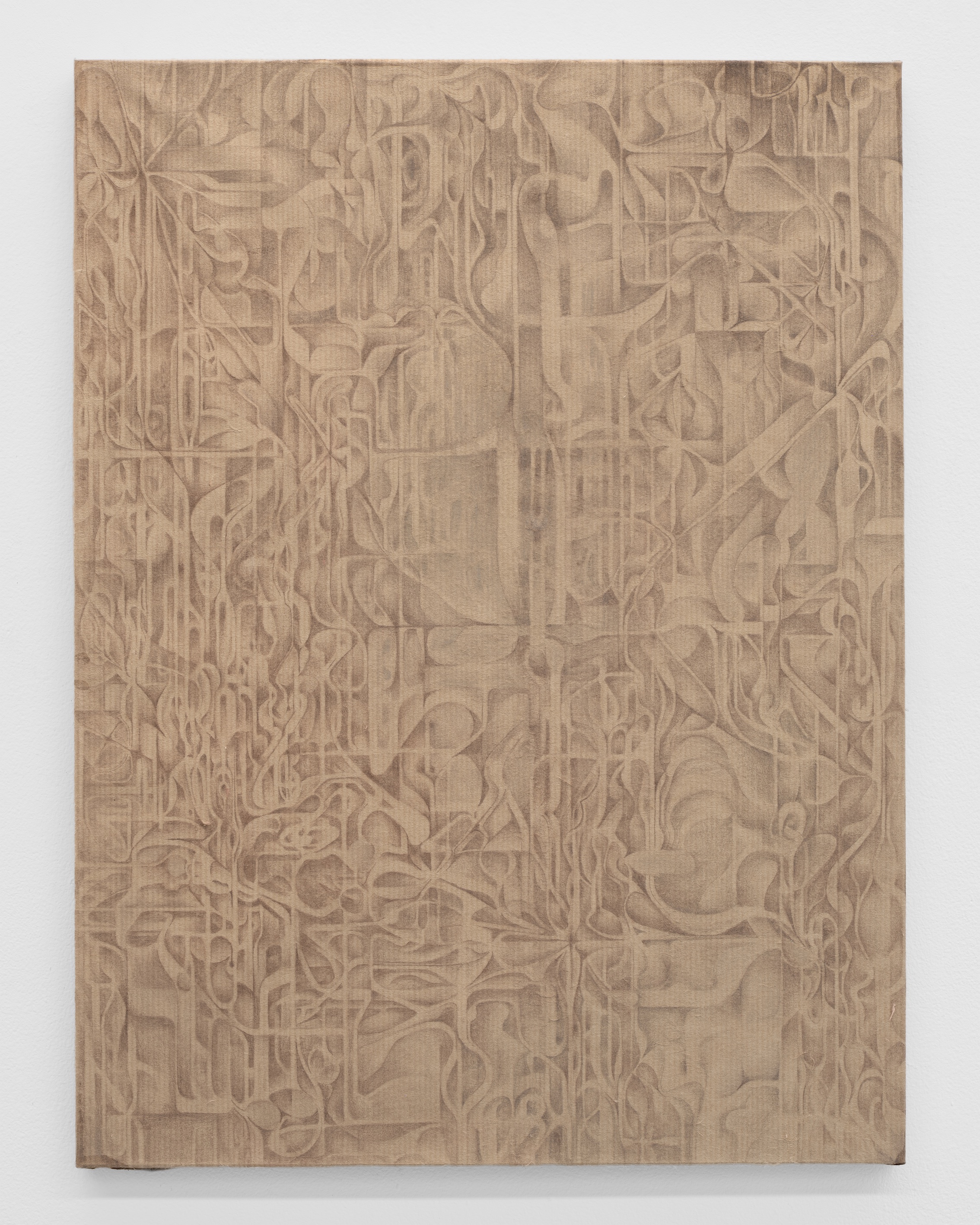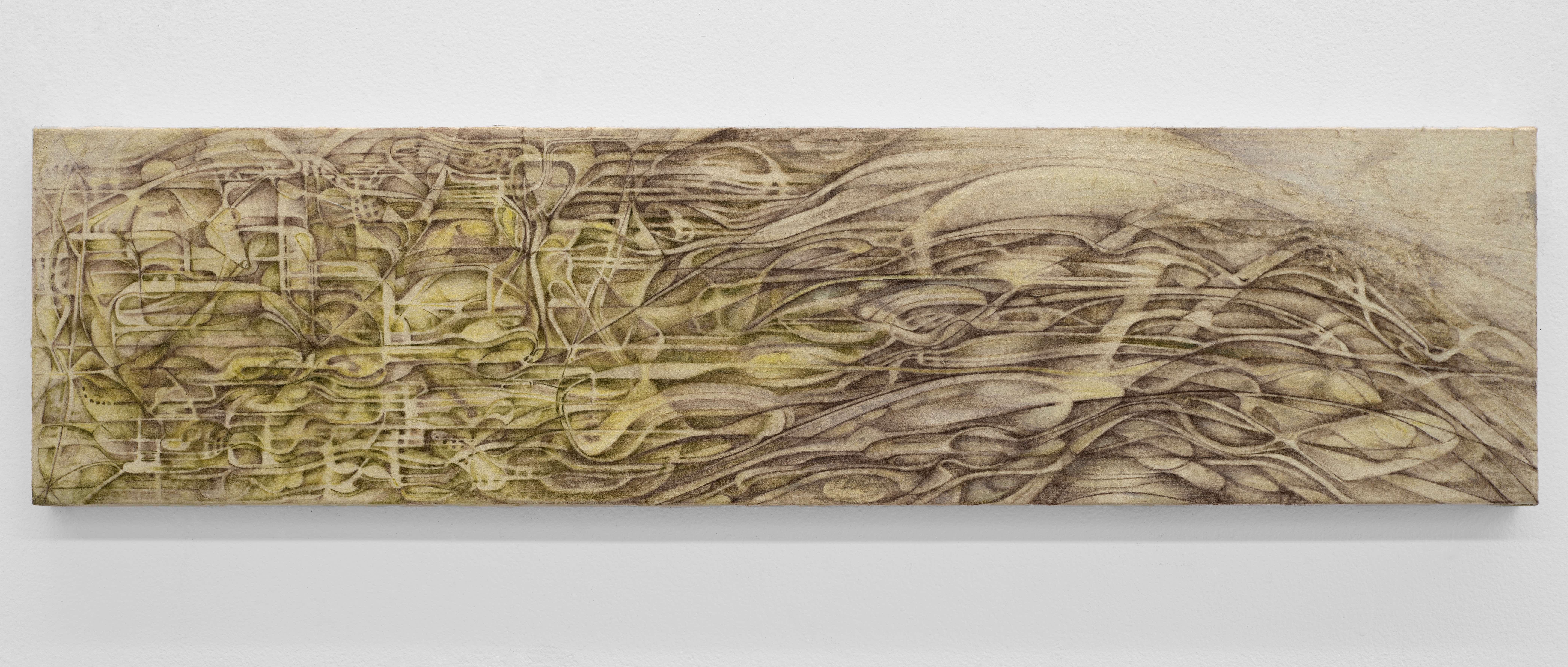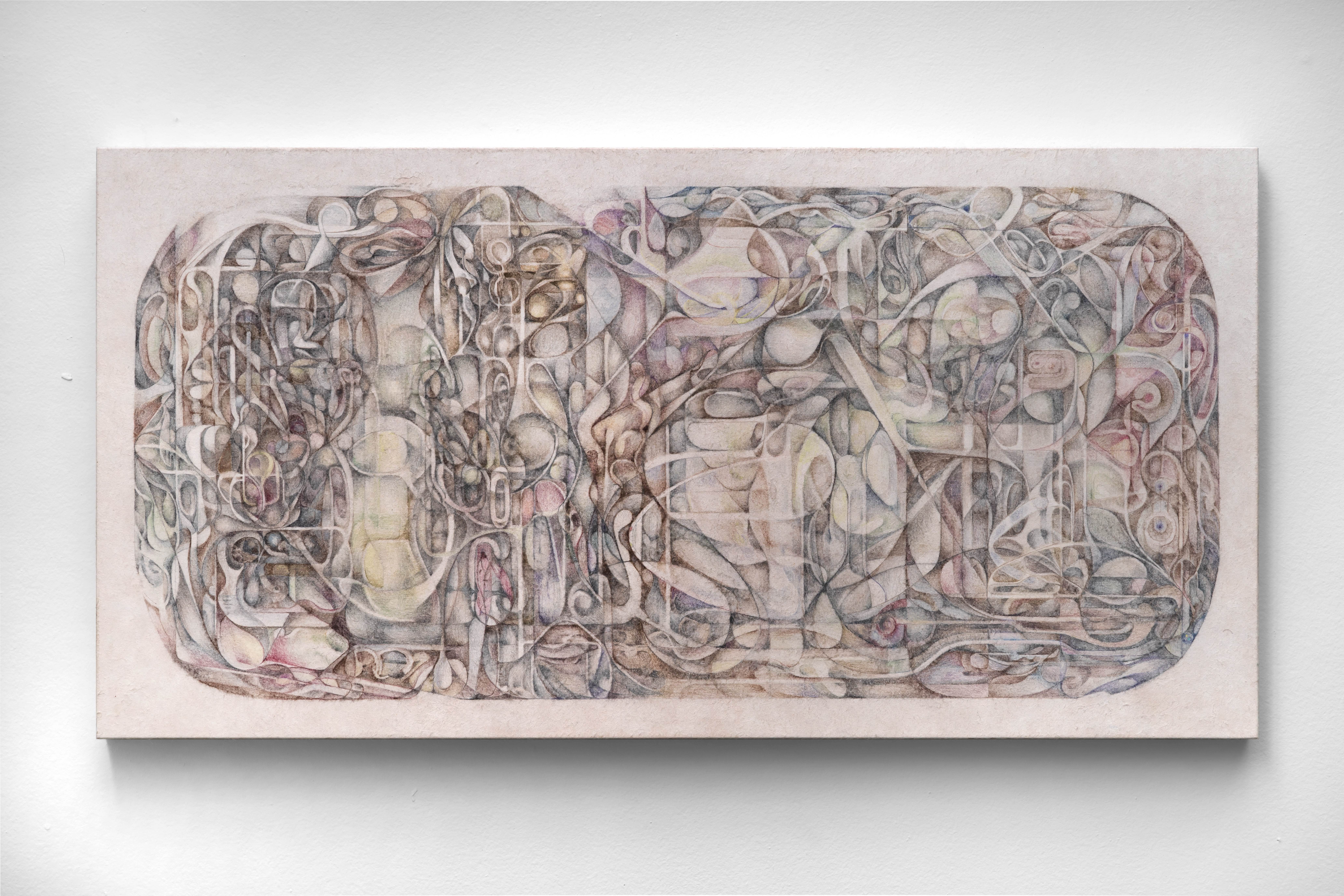 Especially in Washi paper, there are always impressions and corrugations that result from the screened frame used in the papermaking process. I used the grooves as a foundational structure in "Exposed Nervous System," keeping them intact and highlighted through a very limited beige colour palette. I have a problem with control in making work, so having a sort of paper-imposed preset of rules and restrictions makes drawing a back-and-forth experience, in which the paper becomes an active participant while I try to adhere to its constraints.