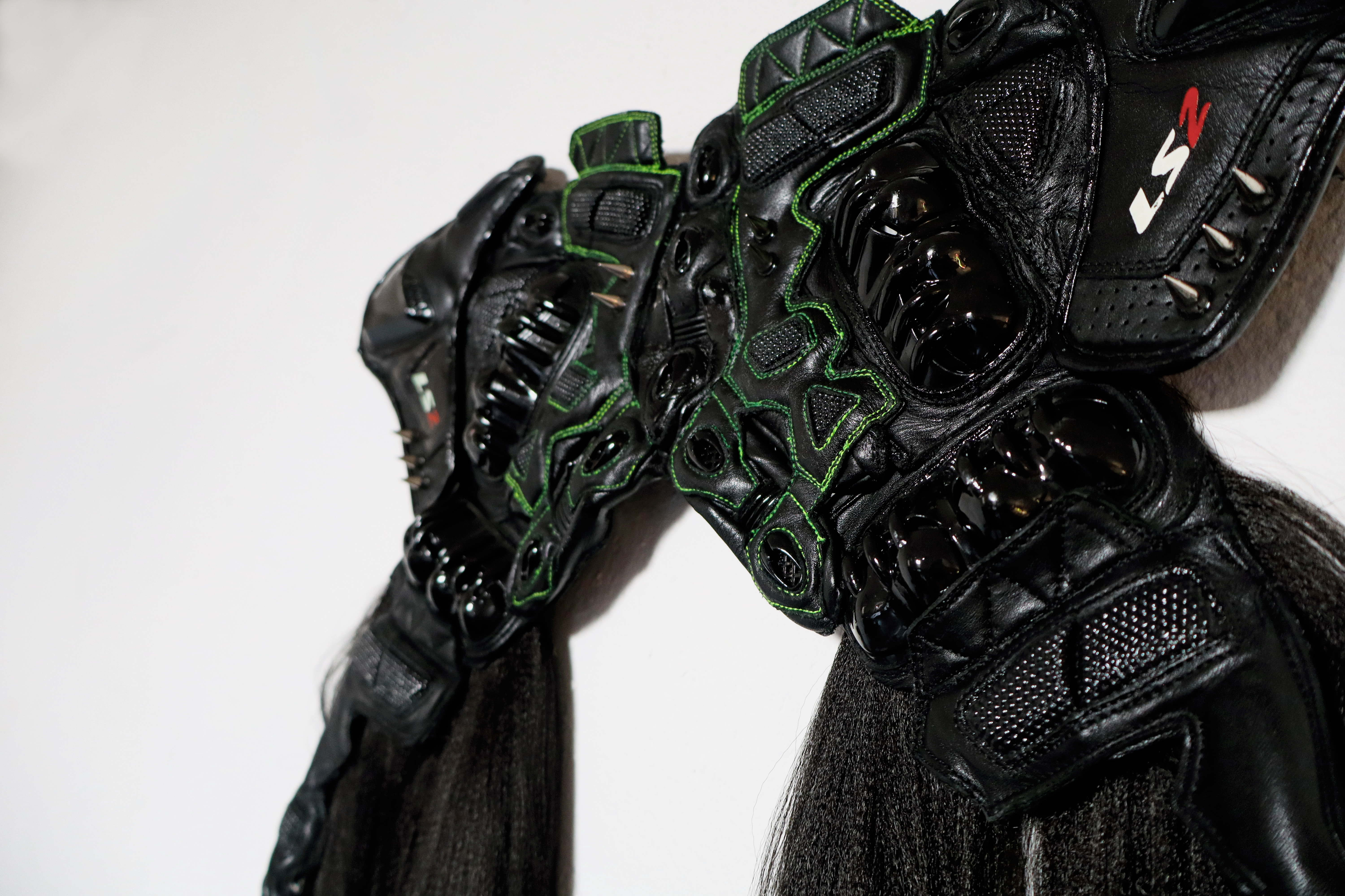 Definitely motorcycle clothing: biker gloves, jackets, protective gear. Motorcycling leather gear carries a heavy cultural coding; it speaks of masculinity, control, aggression, and toughness. It belongs to a lineage of armour, of clothing that promises safety as well as a stylised look. Yet it also slips between worlds: it appears in queer fetishism, in lesbian biker culture, in the aesthetics of subversion. When I slice it open, flatten its seams, and restitch it, it becomes a kind of queer epidermis. By surgically cutting open these leather objects, I am not simply transforming them; I am performing a gesture that reclaims the body, reclaims the right to reshape one’s own surface, and dismantles the masculinised shell they represent.