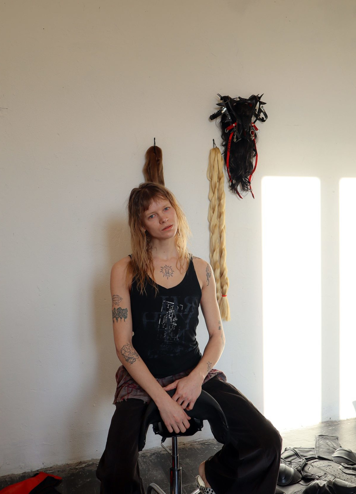 Lucca Cora Süss’s artistic practice revolves around radical transformation and fluid identity. The Zurich-based Swiss artist works with cast-off objects from daily life, altering them through melting, welding, and weaving into newly imagined forms. Grounded in a queer, trans perspective, Süss’s sculptures challenge rigid categories – they remain shapeshifters, constantly in transition. Influenced by thinkers like Susan Stryker, she embraces “monstrosity” as an act of defiance against normative expectations. Through this process-driven approach, Süss opens up a space where materials and bodies alike are free to become something new, subversive, and empowering.