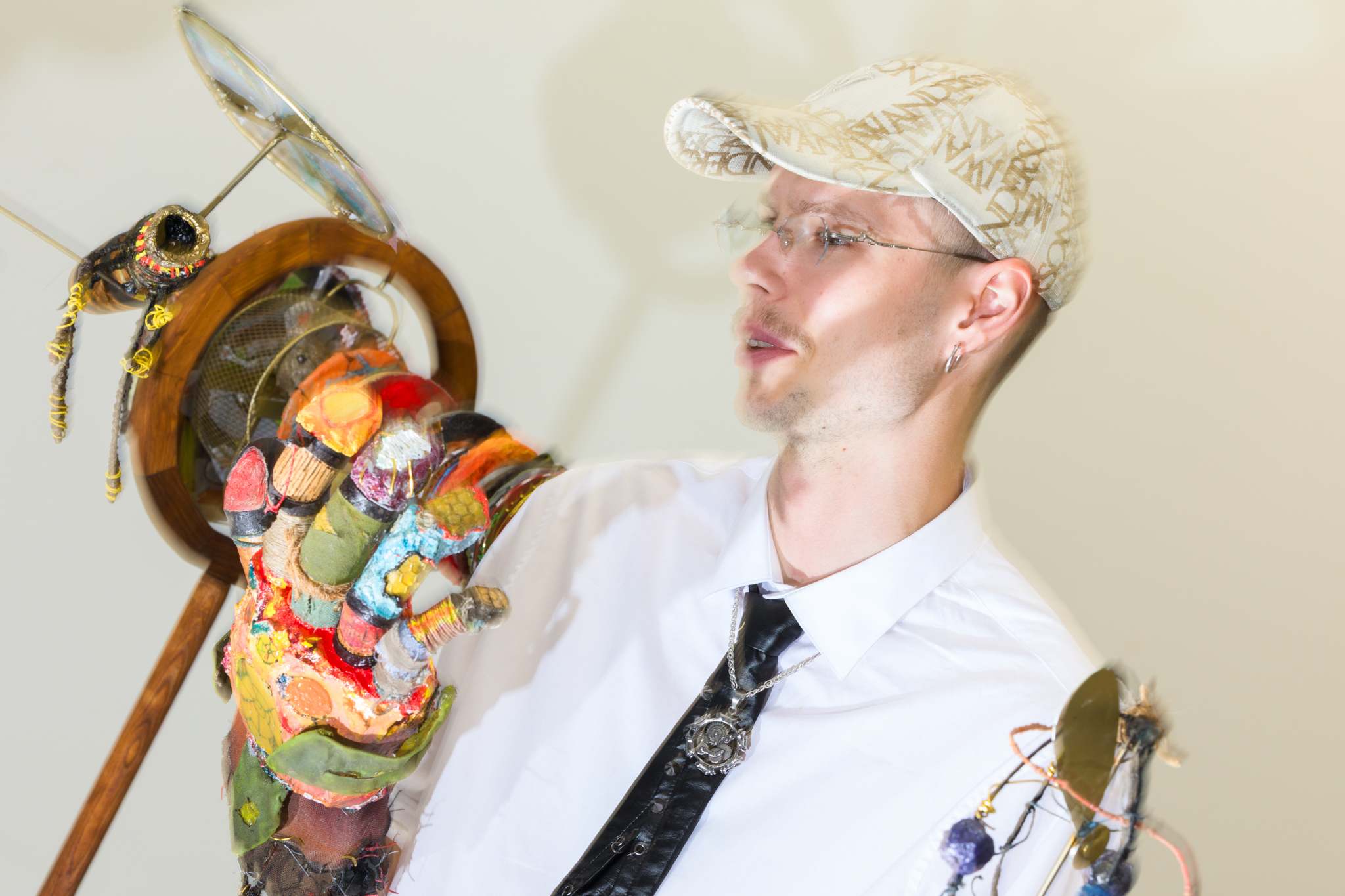 Adam Žufníček (born 1999) is among the most distinctive Czech artists of the emerging generation. His work interweaves inspirations from the visuality of genre subcultures, sci-fi, fantasy, graffiti, DIY practices, and ordinary pop-cultural objects. With extraordinary attention to detail – a trait revealing his initial training in painting – he combines found, natural, artificial, and waste materials. His approach resonates with the “aesthetics of strangeness” of the Šmidra group, particularly Bedřich Dlouhý.