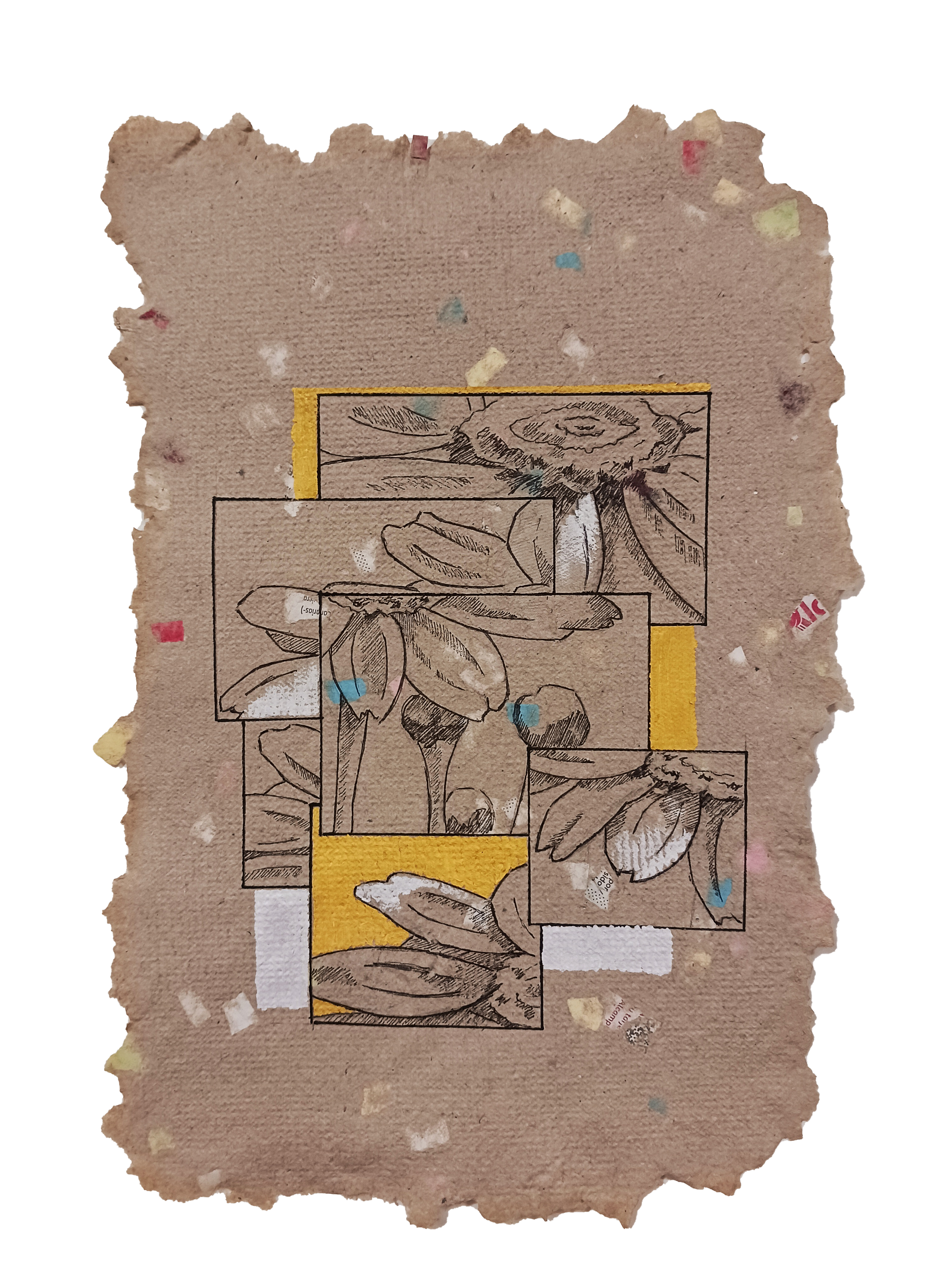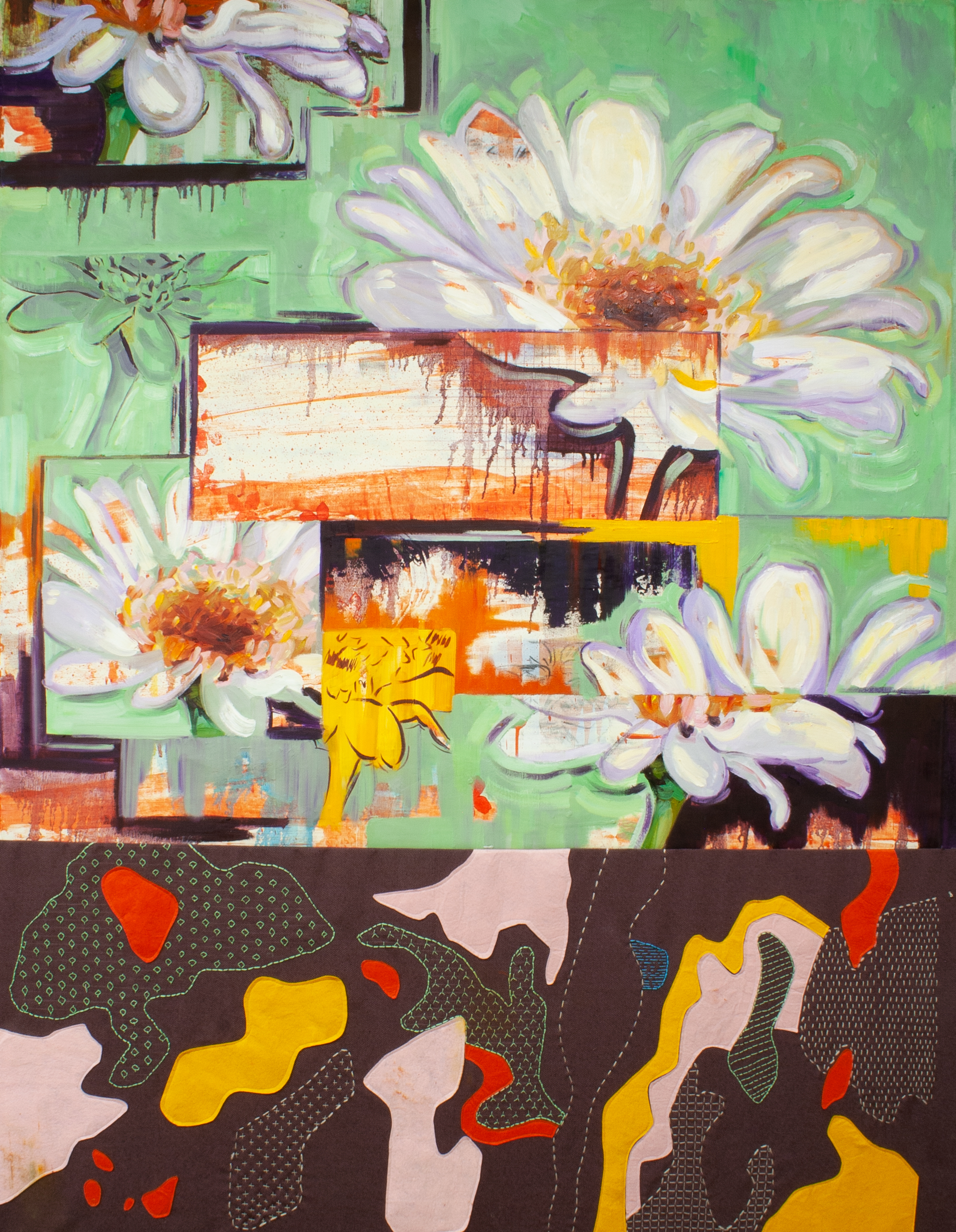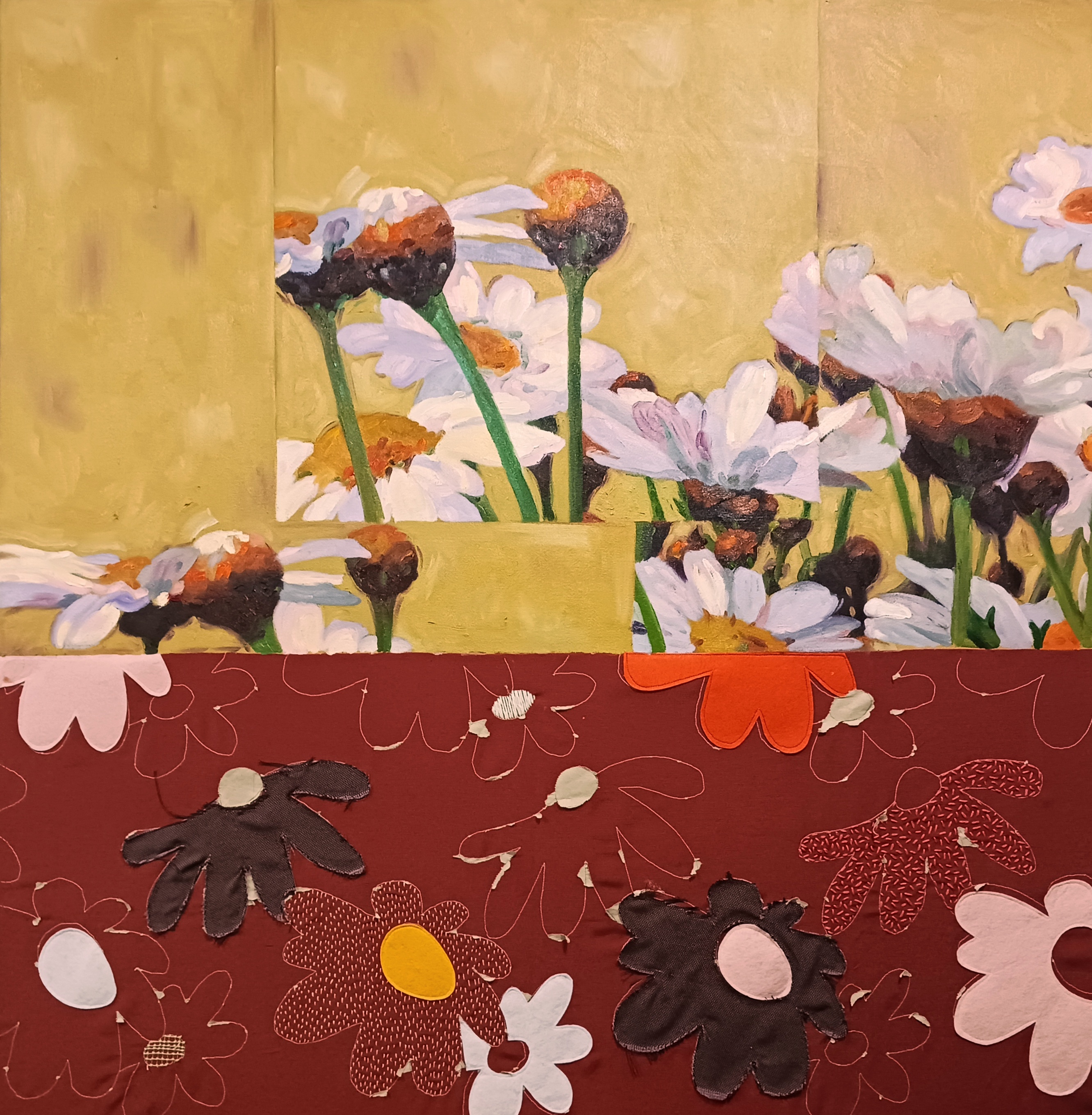 Through embroidery, textile assemblage, and painting, she investigates materiality as a carrier of memory, territory, and lived experience. Her practice understands surface as a layered space where gesture, fabric, and time converge, creating works that move between figuration and abstraction and evoke fragmented landscapes and intimate cartographies.