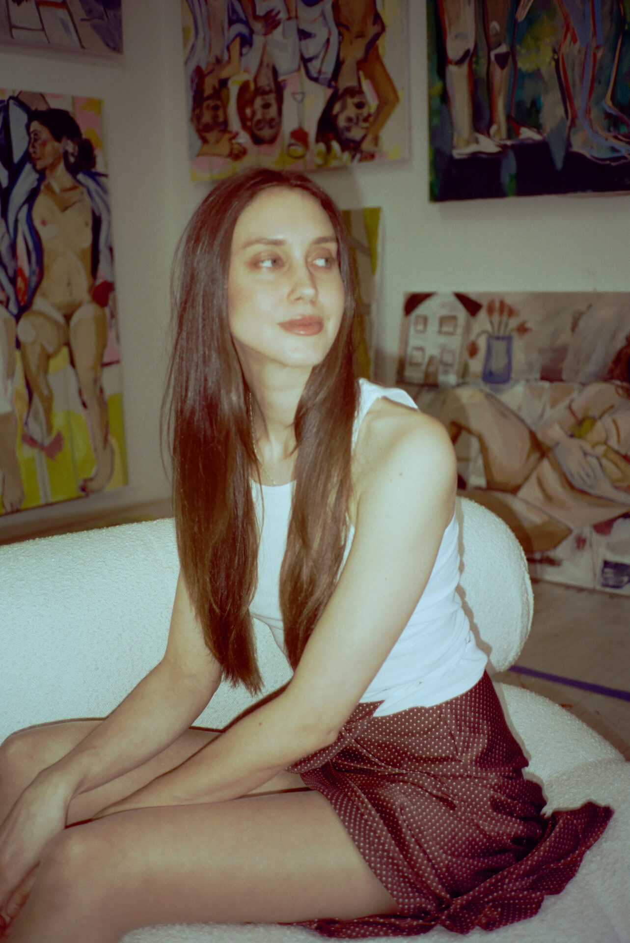 Known for her portrayals of nude feminine figures, Miriam’s subjects exude a playful sense of mystery. Often there are elements to her paintings that would physically be impossible in the real world, however; in the composition Miriam plays with the movement of the eye to convince the viewer these moments feel right. The perception of the viewer is as important to the whole of the painting as the painting itself.
